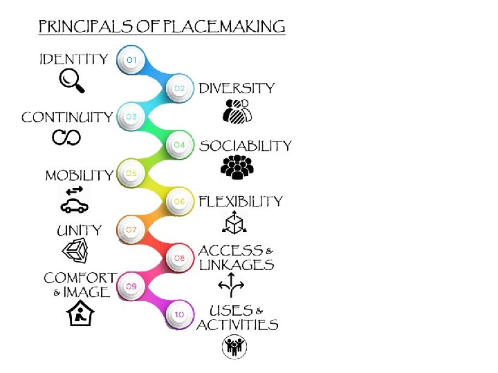 PRINCIPALS OF PLACEMAKING 1. IDENTITY: make innovation visible and public. 2. DIVERSITY: mix innovation with a range of other uses. 3. CONTINUITY: start with existing people and places. 4. SOCIABILITY: refers to the ability of a certain place to attract friends and neighbors to meet and sit together. 5. MOBILITY: connect to regions through multiple transportation modes. 6. FLEXIBILITY: experiment, observe, repeat. 7. UNITY: govern with vision and holistic, inclusive strategies 8. ACCESS & LINKAGES: Accessible place refers to how it’s available and easy to get to and get through the place, the availability of transportations to the place’s location, and the connection between the place and adjacent buildings. 9. COMFORT & IMAGE: A comfortable place makes a good impression for its visitors. With a beautiful image, safety, cleanliness and the availability of seats, comes a memorable impression. 10. USES & ACTIVITIES: Activities in a certain place attracts people to visit and to return back. A good place offers equality between men and women of different