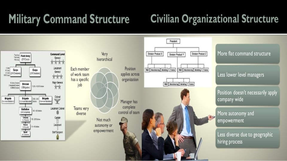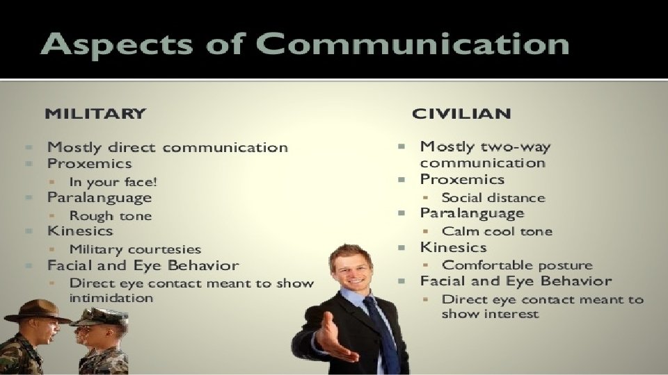 Conclusions Veterans can expect to encounter more cryptic and unclear communication styles, less explicit hierarchies, as well as, an appearance of less competent communicators while adjusting into civilian life. Veterans may also need to rely on Veteran’s Affairs for their healthcare needs, at least at first, and should take the initiative to seek out and advocate for adequate care. Veterans can expect to find something resembling a language barrier when it comes time to communicating about military experience with civilian employers.