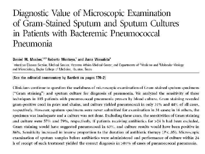 Musher DM et al. Diagnostic Value of Microscopic Examination of Gram -stained Sputum and Sputum Cultures in Patients with Bacteremia Pneumococcal Pneumonia. Clin Inf Dis 2004; 39: 165 -9