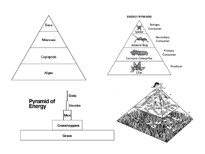 n Ecological pyramids describe the relative amounts of energy or matter at each trophic level