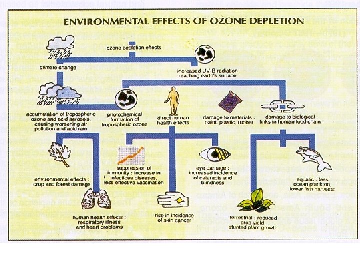 n Acid Rainn Burning fossil fuels releases chemicals that combine with water vapor in atmosphere forming acids n Ozone depletion n CFC’s (chlorofluorocarbons) break down the ozone layer which protects the earth from ultraviolet radiation