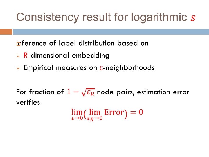F(x) Illustration with [0, 1] types Prob(label(i, j)=5) ? Node i x Node j Use empirical distribution of labels L(i, k) for k in neighborhood of j Embedding allows consistent estimation of label distributions