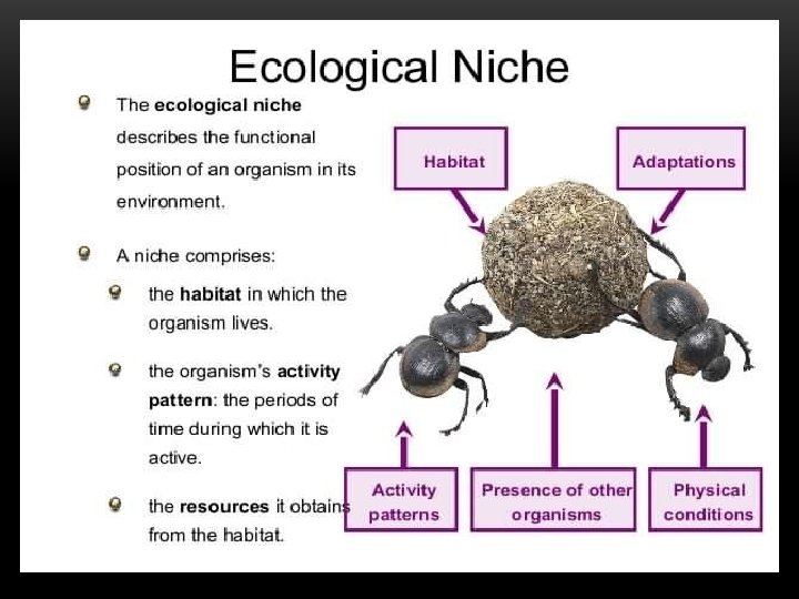 MECHANISMS STRUCTURING ECOLOGICAL COMMUNITIES The ecological niche: • multidimensional description • resource needs • habitat requirements • environmental tolerances (Hutchinson 1957). The fundamental niche is the potential set of conditions which a species can occupy. • It can be determined experimentally. • The niche concept can be further split into two distinct aspects. • (I)Geographic niche, Conditions niche or Beta niche: This simply states that some species live in different