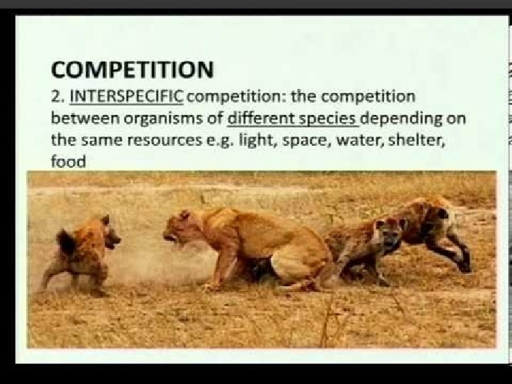 TYPES OF COMPETITION: Competition can be of two types; • INTRASPECIFIC COMPETITION: • Intraspecific competition occurs between individuals of the same species/population EXAMPLES: • self-thinning in crops or forest plantations, competition for females among kangaroo males. • INTERSPECIFC COMPETITION: • Interspecific competition involves individuals from different species/populations • EXAMPLES: • weeds and the crop in an agricultural field, marsupials and birds competing for nesting sites in dead trees.