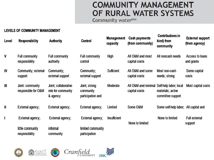 • A key output from this research will be a categorisation of different community-management and sustainable services partnering models along with trajectories for professionalization, including costing, for the sustainable delivery of the range of alternative technologies. • We see this categorisation giving us the confidence to plan in any forthcoming project proposals that: – rural water supply through handpumps in type ‘X’ socio-economic context’ – requires a ‘level 2’ support system – with ‘Band A’ capital maintenance budgetary support and – zero potential cost recovery – whereas a ‘single village piped scheme’ in a ‘Y’ setting – requires ‘level 4’ support system with – ‘Band C’ budgetary support but – ‘level IV’ potential for cost recovery.
