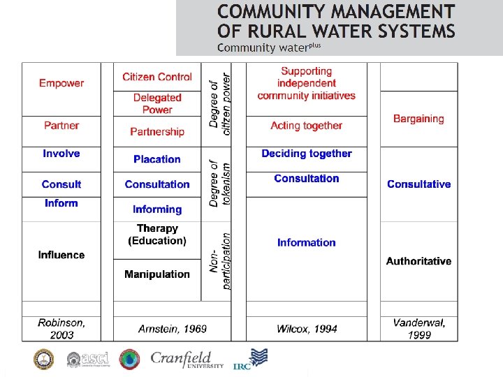 The objectives of community participation in the context of development programs may include: • a) sharing project costs (beneficiaries contribute money or labor) • b) increasing project efficiency (beneficiaries assist in project planning and implementation) • c) increasing project effectiveness (beneficiaries have a say in project design and implementation) • d) building beneficiary capacity (beneficiaries share in management tasks or operational responsibilities) • e) increasing community empowerment (beneficiaries share power and increase their political awareness and influence over developmental outcomes) • Community Management of Rural Water Supply and Sanitation Services , Mc. Common, Warner and Yohalem, World Bank, 1990