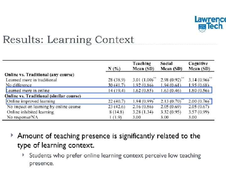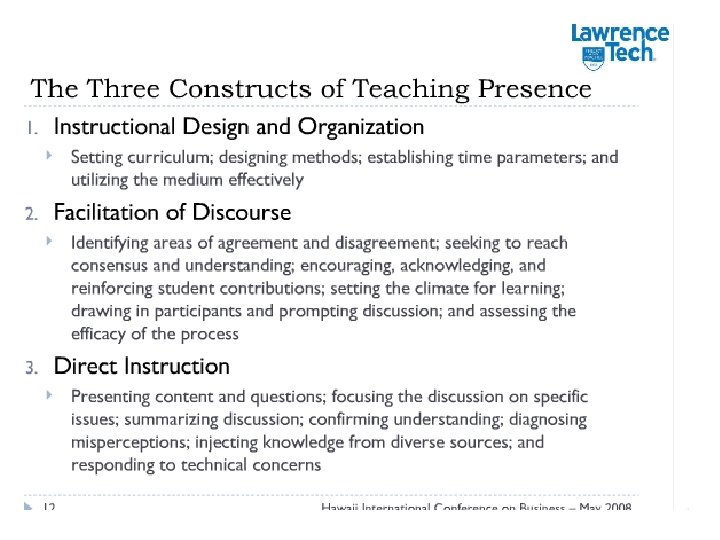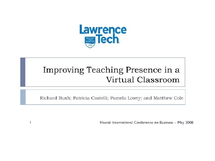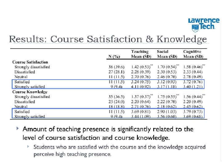 • “Our research has demonstrated that teaching presence is important to student satisfaction, student knowledge and learning context. Students who were dissatisfied indicated that teaching presence was low. Therefore, faculty need to do more to improve teaching presence. ” – THE IMPORTANCE OF TEACHING PRESENCE IN ONLINE AND HYBRID CLASSROOMS Richard Bush. Patricia Castelli Pamela Lowry 2010 Proceedings of the Academy of Educational Leadership, Volume 15, Number 1