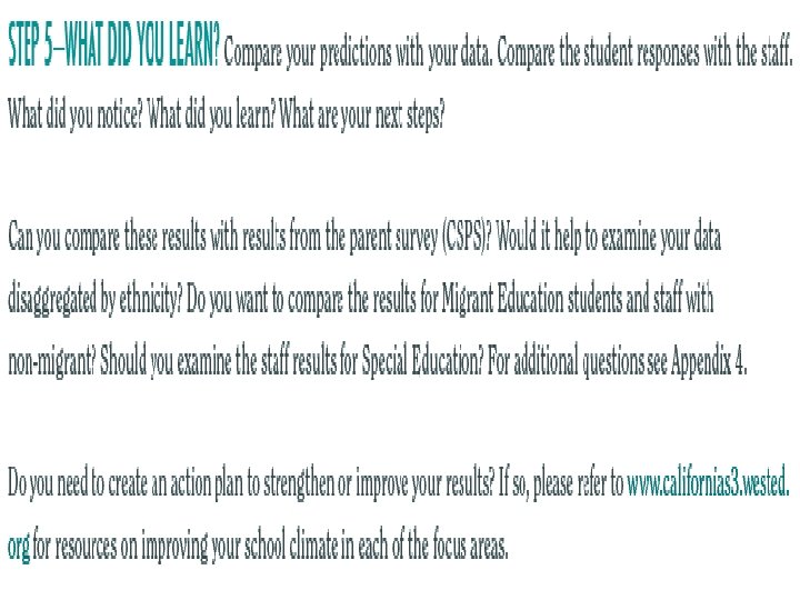 REVIEWING LOCAL DATA 1. Locate local data (i. e. , county, district, school level Cal -SCHLS reports). 2. Select the risk and protective factors you want to review (i. e. , caring relationships and substance use). 3. Check your assumptions (i. e. , your predictions about risk and protective factors). 4. Compare your predictions with the actual data. 5. Dig deeper (i. e. , look at the same data disaggregated by ethnicity or gender). 6. Select priorities.