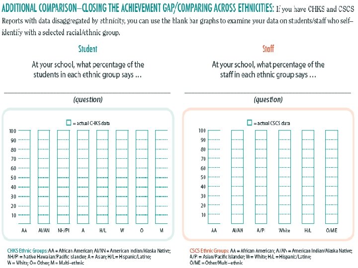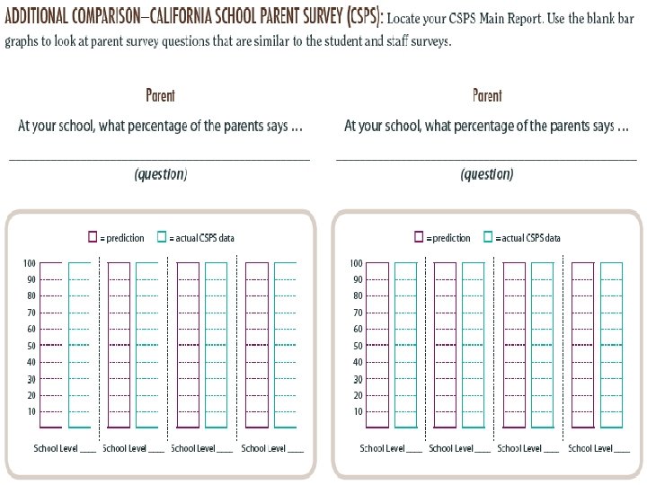 STEP 3—ACTUAL STUDENT: Locate STEP 4—ACTUAL STAFF: Locate your CHKS Reports and look at the actual CSCS Reports and look at the actual data for that question Example: Refer to Table A 3. 11 on page 14 in the CHKS Main Report. Example: Refer to Table 3. 1 on page 18 in the CSCS Main Report Color in the green columns with your actual percentage.