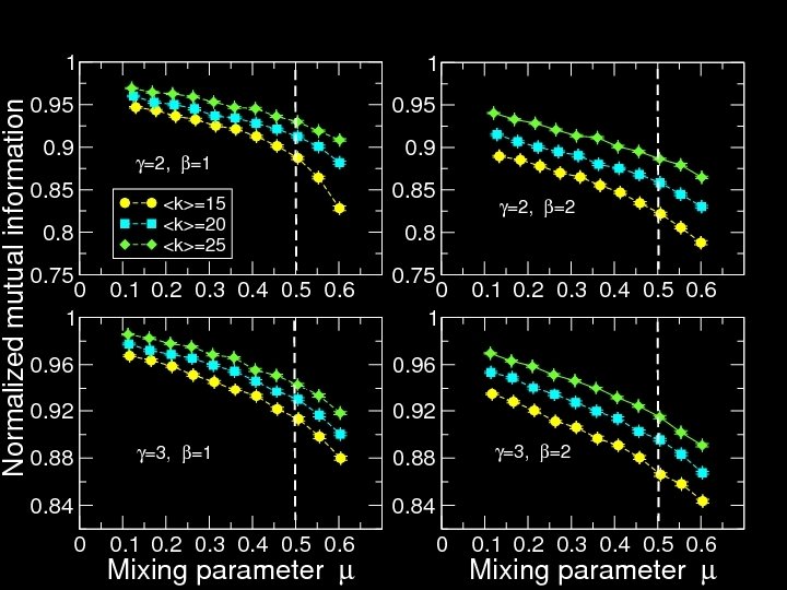 New benchmark (A. Lancichinetti, S. F. , F. Radicchi, ar. Xiv: 0805. 4770) • Power law distribution of degree • Power law distribution of community size • A mixing parameter μsets the ratio between the external and the total degree of each node