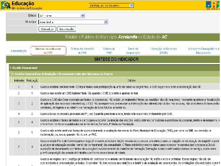 7. Na aba SÍNTESE DO INDICADOR DO PAR, estão discriminados os critérios de avaliação para as quatro grande dimensões que estruturam o diagnóstico da situação educacional local e seus indicadores. As grandes dimensões são: 1. Gestão Educacional 2. Formação de Professores e dos Profissionais de Serviço e Apoio Escolar 3. Práticas Pedagógicas e Avaliação 4. Infra-estrutura física e Recursos Pedagógicos