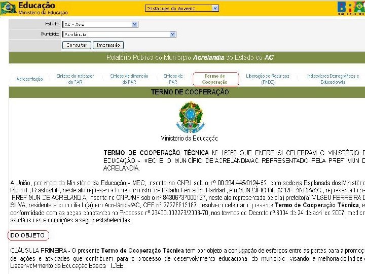 10. Na aba TERMO DE COOPERAÇÃO está o documento que confirma a conjugação de esforços entre o município e o Ministério da Educação a fim de contribuir para o desenvolvimento educacional local. Estão ali discriminadas informações do tipo: objeto, ações, atribuições dos partícipes, vigência, alterações, recursos, rescisão, dentre outros