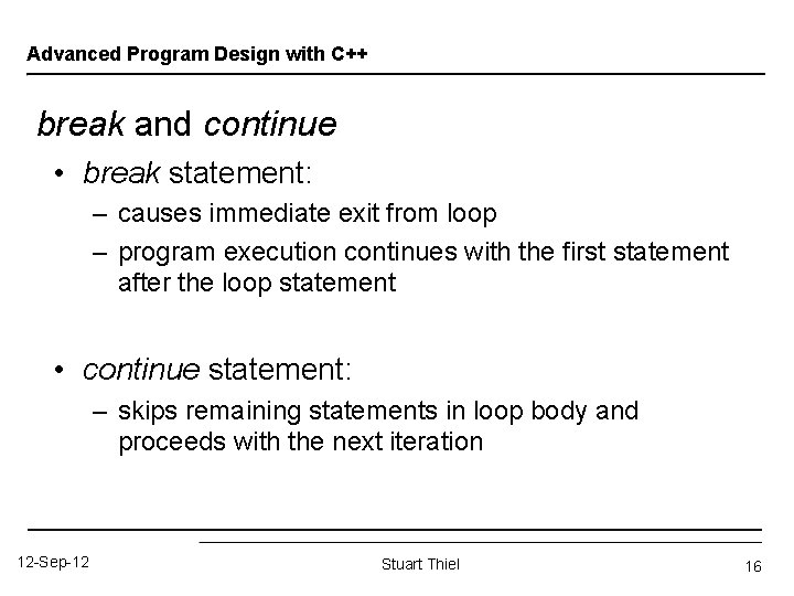 Advanced Program Design with C++ break and continue • break statement: – causes immediate exit from loop – program execution continues with the first statement after the loop statement • continue statement: – skips remaining statements in loop body and proceeds with the next iteration 12 -Sep-12 Stuart Thiel 16