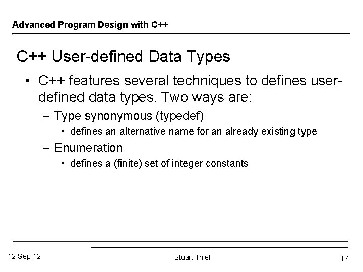 Advanced Program Design with C++ User-defined Data Types • C++ features several techniques to defines userdefined data types. Two ways are: – Type synonymous (typedef) • defines an alternative name for an already existing type – Enumeration • defines a (finite) set of integer constants 12 -Sep-12 Stuart Thiel 17