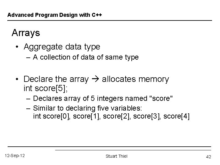 Advanced Program Design with C++ Arrays • Aggregate data type – A collection of data of same type • Declare the array allocates memory int score[5]; – Declares array of 5 integers named "score" – Similar to declaring five variables: int score[0], score[1], score[2], score[3], score[4] 12 -Sep-12 Stuart Thiel 42