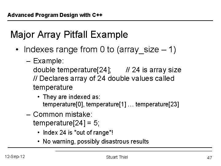 Advanced Program Design with C++ Major Array Pitfall • Array indexes always start with zero! • Zero is "first" number to computer scientists • C++ will "let" you go beyond range – Unpredictable results – Compiler will not detect these errors! • Up to programmer to "stay in range" 12 -Sep-12 Stuart Thiel 46