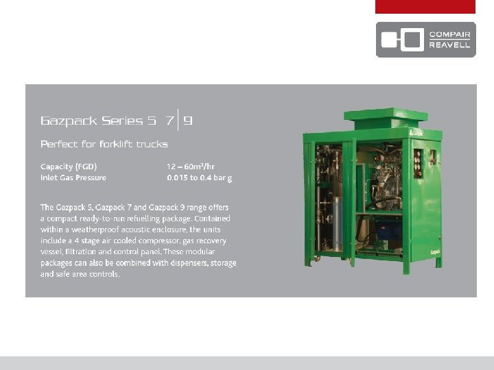 COMPAIR REAVELL – Kim my jesteśmy REAVELL jest najchętniej wybieranym dostawcą technologii sprężania powietrza i gazu do różnych zastosowań i dla szerokiego spektrum klientów. Wszędzie, gdzie stosowane są technologie sprężania wysokociśnieniowego, zawsze służymy naszymi rozwiązaniami. REAVELL zaspokaja potrzeby najbardziej wymagających klientów w różnych sektorach, od tankowania sprężonego gazu ziemnego na pięciu kontynentach po wspieranie procesów przemysłowych, systemy powietrza do oddychania, a także systemy stosowane na platformach wiertniczych oraz przez jednostki obronne.