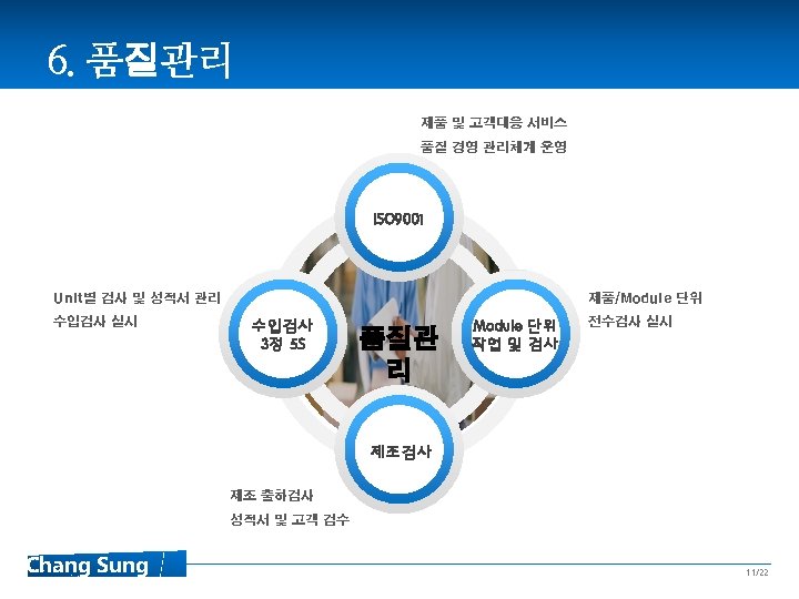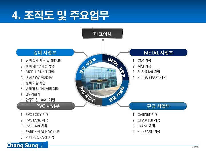 Contents 1 Introduce 2 History 3 조직도 및 주요 업무 4 장비사업부 소개 5 창성 시스탬 6 품질 관리 7 Equipment 8 Sales Record 02/22