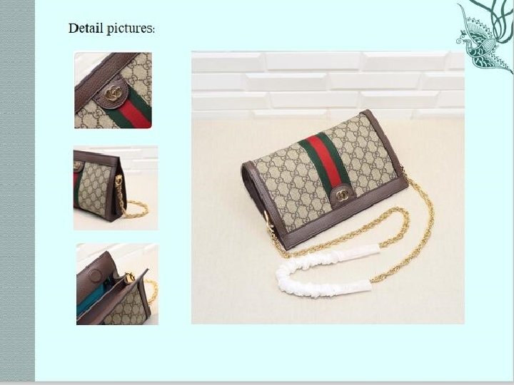 *热销产品一: Gucci Ophidia Name(品名): Gucci Ophidia Size(尺寸): small(小号): W 26 cm✖ H 17 cm✖D 8 cm large(大号): W 32. 5 cm✖H 20 cm✖D 10 cm Gucci Ophidia is Gucci’s adorable vintage vibe, and classic GG print. its brown leather. Which was made of cowhide material. There exists a green and red strip in the middle. It was made of golden hardware. They are all the classic elements of Gucci. 古驰的Ophidia这款包是最复古的一款包, 经典的GG印花。它棕色牛皮材质。中间 有一条经典绿色和红色的带子。金色的 五金制成的,它们都是古驰的经典元素。