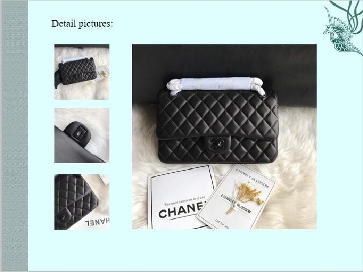 *热销产品二: Chanel classic flap Name:Chanel Classic Flap 品名:香奈儿经典翻包 Price(价格): 629 USD size(尺寸): Medium(中号) color(颜色): classic black 简单的设计不失优雅,适合每个女生 simple design is elegant, suitable for every girl.