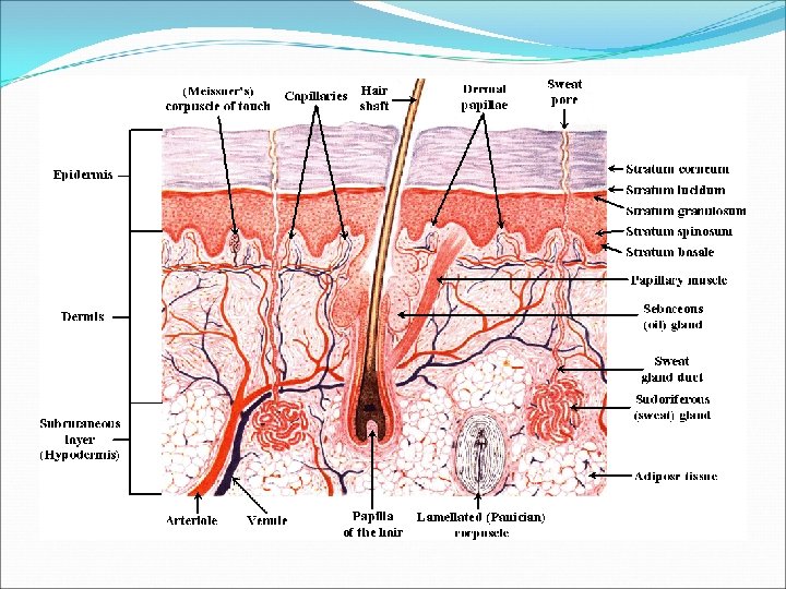 The skin of Mammals 1 - Epidermis : stratified squamous epithelium rest on a basement membrane. Basal layer known as germinative or malpighian layer while the most outer layer is horny (called stratum corneum). 2 - Dermis : built up of a dense areolar connective tissue