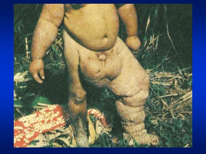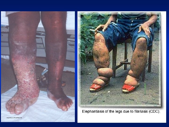 Elephantiasis: is a rare disorder of the lymphatic system caused by parasitic worms such as Wuchereria bancrofti, Brugia malayi, and B. timori, all of which are transmitted by mosquitoes. Inflammation of the lymphatic vessels causes extreme enlargement of the affected area, most commonly a limb or parts of the head and torso. It occurs most commonly in tropical regions and particularly in parts of Africa.