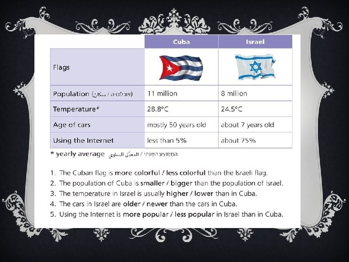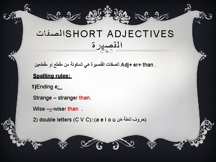 ﺍﻟﺼﻔﺎﺕ ﺍﻟﻄﻮﻳﻠﺔ Long adjectives ﺍﻟﺼﻔﺎﺕ ﺍﻟﻘﺼﻴﺮﺓ Short adjectives Big ----bigger than v Hot ---hotter than v Fat ---fatter than. v 3) Ending y: v ﺍﻛﺜﺮ ﻣﻦ ﻣﻘﻄﻌﻴﻦ More +adj+than. v Beautiful ---more beautiful v than. Dangerous ----more v Heavy ----heavier than. v dangerous than. Easy ----easier than v Expensive ---more v Pretty ----prettier than v expensive than.