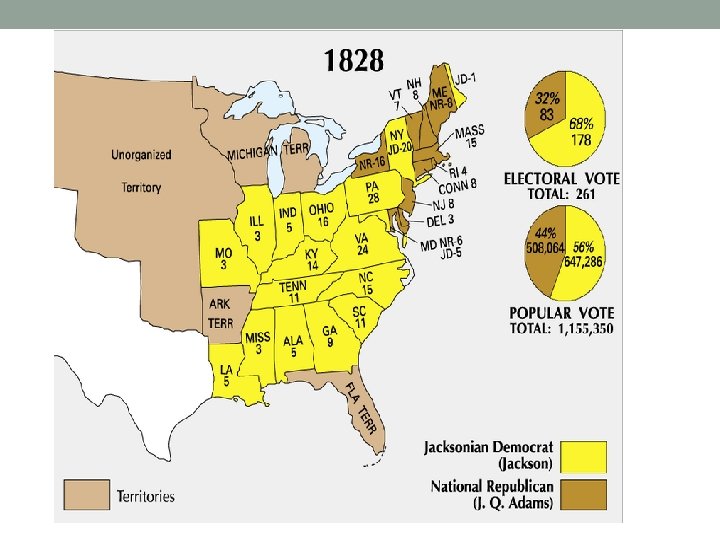 The Election of 1828 AJACK supporters formed the Democratic-Republicans (Democrats) I. A. Common man, middle class, national support II. John Quincy Adams: National Republicans A. Elitist, rich , wealth support from New England only III. Considered the first modern election A. Mudslinging, slogans, rallies, and buttons introduced to campaigning B. Personal attacks at each other C. Really nasty election