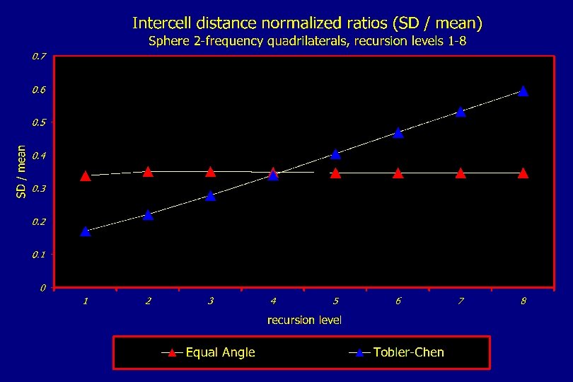 Results - Intercell Distances v Asymptotic behavior of normalizing statistic, levels out at higher recursion levels v Fuller-Gray had lowest SD/mean ratio for all combinations v Equal Angle and Tobler-Chen methods had high SD/mean ratios v Triangles, hexagons and diamonds show little variation from one another