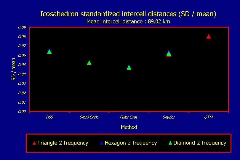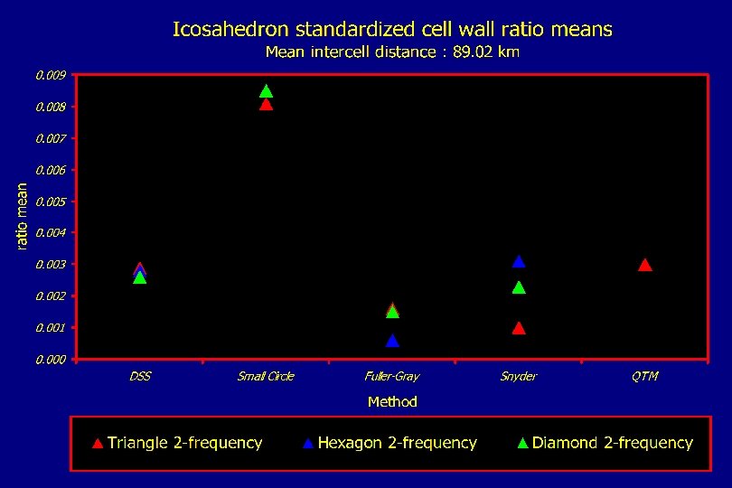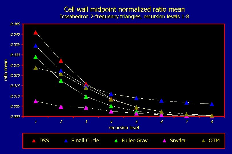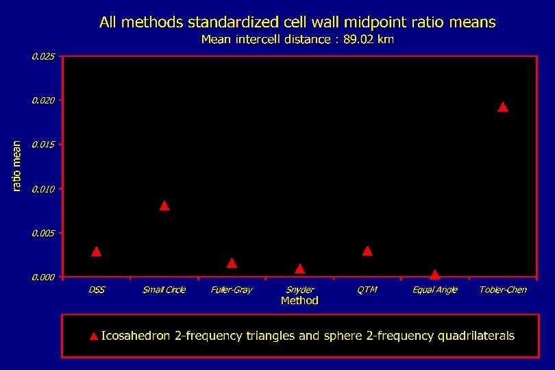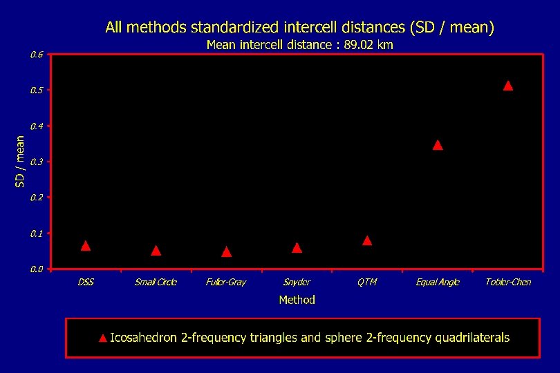 Spatial pattern of cell wall midpoint measurements Icosahedron triangular 2 -frequency DGGSs, recursion level 4 DSS Fuller-Gray QTM 0. 0683 Small Circle Snyder 0. 0000