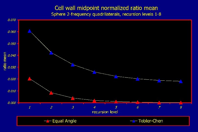 Results - Cell Wall Midpoints v Asymptotic behavior approaching zero v Equal Angle has lowest mean ratios with Snyder and Fuller-Gray performing best for methods based on Platonic solids v Small Circle subdivision and Tobler-Chen only DGGSs where mean ratio did not approach zero v Projection methods did as well (or better) than methods that were modeled with great and small circle edges v Triangles performed slightly better than hexagons and diamonds
