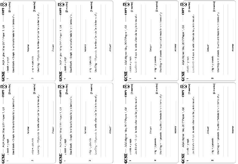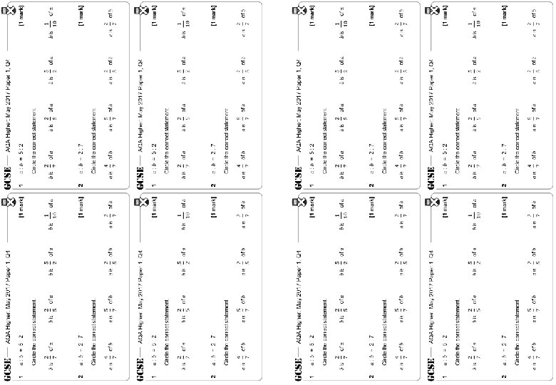 Comparing Ratios – Higher – GCSE Questions – AQA These questions are the same format as previous GCSE exams. COPY means they use the exact same numbers as the original GCSE question. Otherwise, they are clone questions using different numbers. The worksheets are provided in 2 sizes.