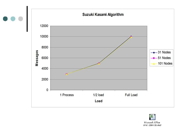 Raymond’s Staright-Line 600 500 400 370 31 Nodes 300 51 Nodes 101 Nodes 200 100 0 1 at a time 1/2 Load Full Load For a straight line when all the nodes are requesting simultaneously, for execution of all the critical section the number of messages required is 2 N However if few number of nodes are requesting at different states the number of messages vary depending on the location of requesting nodes in the chain. For half load conditions it is like reducing load due to the random selector used for selecting requesting process.