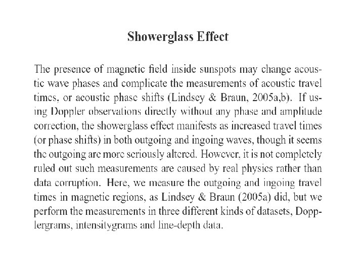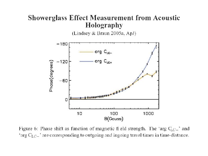 Comparison of Holography and Time-Distance on Showerglass Effect For Dopplergrams, both holography and time-distance show that outgoing and ingoing travel times increase with magnetic field strength, and that outgoing travel times increase faster than the ingoing travel times when magnetic field strength is high. However, one big difference between holography and timedistance is that, acoustic travel time variations can be as large as 1. 5 minutes with high magnetic field from holography, but for time-distance, it is only about 0. 4 minutes on average.