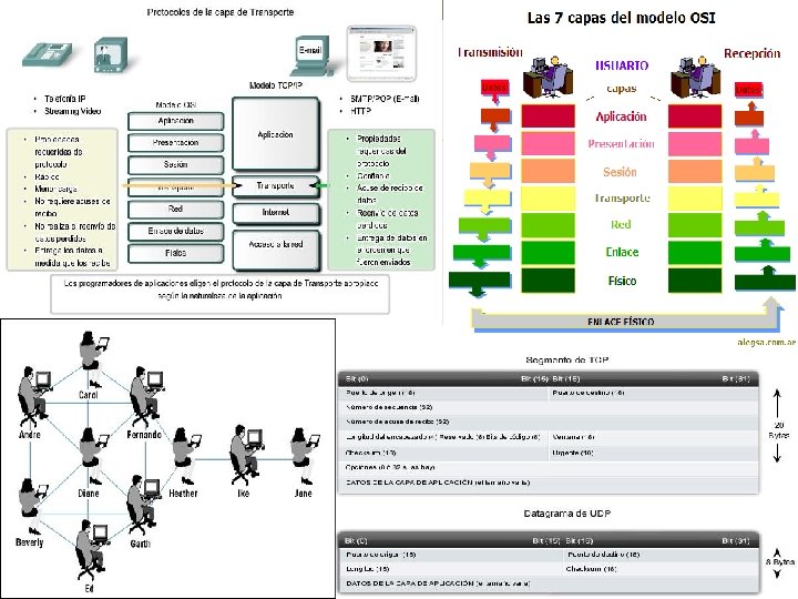 PRELIMINAR Las redes de datos e Internet brindan soporte a la red humana al proporcionar la Comunicación continua y confiable entre las personas, tanto de manera local como alrededor del mundo. En un único dispositivo, las personas pueden utilizar varios Servicios como e-mails, la Web y la mensajería instantánea para enviar mensajes o recuperar información. Las aplicaciones como clientes de correo electronico, exploradores Web y clientes de mensajería instantánea permiten que las personas utilicen las computadoras y las redes para enviar mensajes y Buscar Información. Transmisión: sobre un canal de una sola línea, la mayoría de las redes de comunicaciones utilizan la transmisión en serie entre terminales y computadoras. En la transmisión serie los bits van uno detrás de otro a través de un cable que requerira de una sincronización. Paralelo: Los datos pueden transmitirse entre computadores y terminales mediante cambios de corriente o tensión en un cable, salen un grupo de bits a la vez por varias líneas (Se pude decir que el paralelo es la unión de varias series), o sea cada bit de un carácter se traslada por su propio cable. Esta es útil a corta distancia, siendo más rápida. Aplicación: destino final de los datos donde se proporcinan los servicios al ususario. Presentación: se convierte en interprete de los datos que se utilizaran en la aplicación. Sesión: se encarga de ciertos aspectos de la comunicación y control de sus tiempos. TRANSPORTE: lleva toda información de manera fiable para que llegue a su destino. Red: encargada de dirigir los datos a diversas rutas, encaminando y eligiendo en forma eficaz su destino. Enlace: controla el flujo de datos y sincronización de errores que puedan producirse. Fisico: aspectos de conexión, transmisión y hardwares.