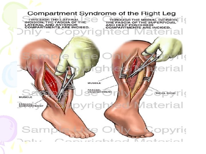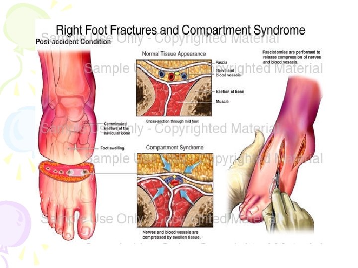 Complications list for Compartment Syndrome: Muscle contracture Muscle weakness Sensory loss Infection fractures