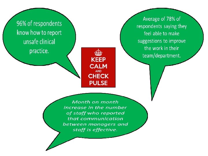10% increase since December for those who would recommend the Trust as a place to have care or treatment. Average of 78% of respondents saying they feel able to make suggestions to improve the work in their team/department. Fewer staff each month reporting they have witnessed bullying. 19% increase in those who responded recommending the Trust as a place to work since December survey.