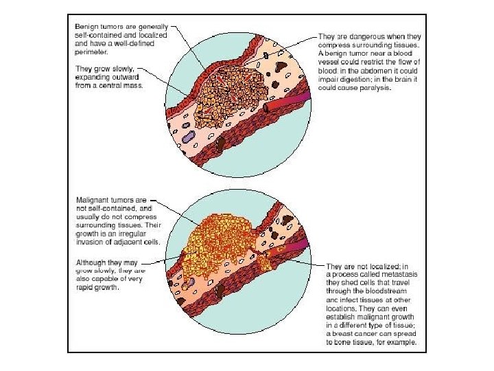 • Benign tumors are not cancerous – these cells do not spread to other parts of the body • Malignant tumors are cancerous – these cells break loose and can invade and destroy healthy tissue in other parts of the body (called metastasis)