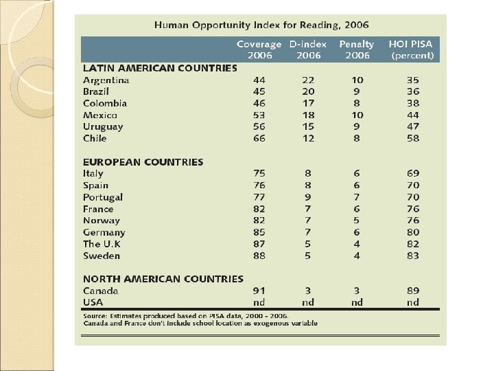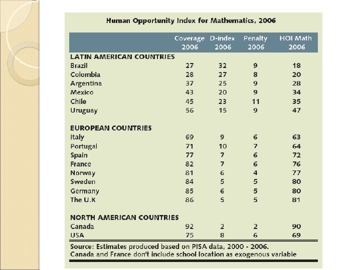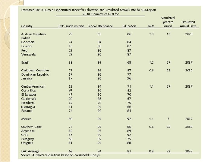 Mas evidencia: Desigualdad de oportunidades educativas HOI 2010: Do our children have a chance? Trabajo de WB donde colaboré � Se construye HOI: refleja si las circunstancias personales (como el lugar de nacimiento, la educación familiar, o el género del jefe de hogar) impactan la probabilidad de que un niño acceda a los servicios necesarios para ser exitoso en la vida, tales como educación, el agua potable, cloaca o la conexión eléctrica. � El HOI va de cero a 100; una sociedad que ha alcanzado cobertura universal de todos los servicios básicos tiene un puntaje de 100. � Para poder hacer comparaciones a través de países y a través del tiempo, el HOI que se presenta para la región en este informe incluye solo los servicios y circunstancias disponibles en todas las encuestas de hogares. Específicamente, se observa el acceso a agua, electricidad y saneamiento, la asistencia escolar y la �