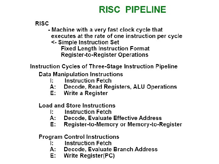 – Pipeline Conflicts : 3 major difficulties • 1) Resource conflicts – memory access by two segments at the same time • 2) Data dependency – when an instruction depend on the result of a previous instruction, but this result is not yet available • 3) Branch difficulties – branch and other instruction (interrupt, ret, . . ) that change the value of PC – Data Dependency • Hardware – Hardware Interlock » previous instruction Hardware Delay – Operand Forwarding » previous instruction, register » Software – Delayed Load » previous instruction No-operation instruction – Handling of Branch Instructions • Prefetch target instruction – Conditional branch: - branch target instruction (