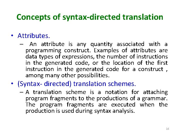 Syntax-Directed Translation • Syntax-directed translation is done by attaching rules or program fragments to productions in a grammar. • For example, consider an expression expr generated by the production: • We can translate expr by exploiting its structure, as in the following pseudo-code: 15