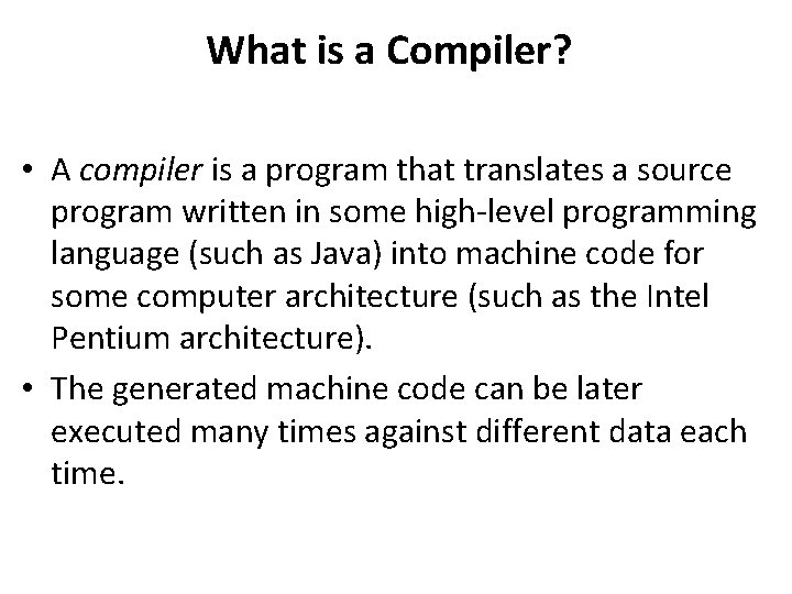 What is a Compiler? • A compiler is a program that translates a source program written in some high-level programming language (such as Java) into machine code for some computer architecture (such as the Intel Pentium architecture). • The generated machine code can be later executed many times against different data each time.