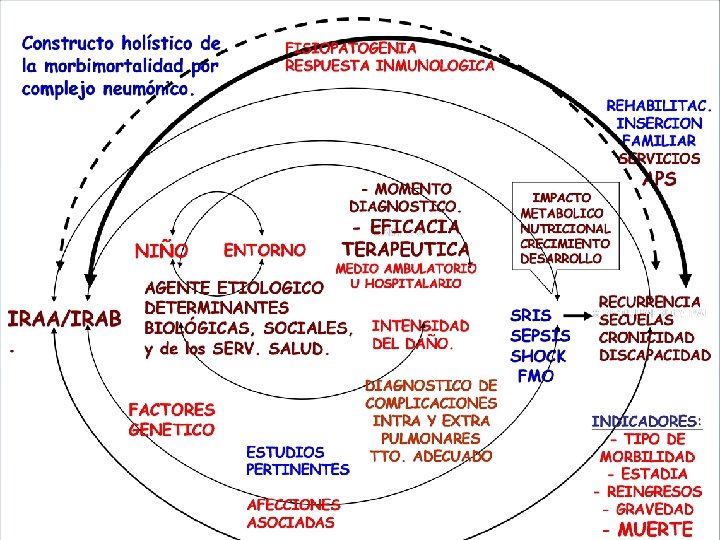 Entorno causal Visión holística IRB y neumonías. Condiciones medioambientales Agente etiológico NIÑO Familia/Hogar. IRAB Defensas APS Factores de riesgo y MCA ASS Fisiopatogenia Nutrición Diagnóstico Clínica Tratamiento Mejoría ▲Daño pulmonar Sostén No complicada Complicada Antibióticos o no. Pronóstico Intensivismo Secuelas ECI? Morbilida d. Mortalida d.