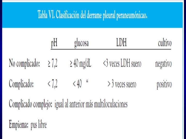 Complicaciones de la NAC. • Las más frecuentes son el derrame pleural y la neumonía abscesificada o necrotizante. • El derrame pleural es las causa más frecuente de fracaso del tratamiento. Ante la persistencia de los síntomas o signos infecciosos, buscar derrame. Sus patógenos más frecuentes son el neumococo, el S. aureus y el S. pyogenes. • La abscesificación se observa con frecuencia, especialmente en la neumonía neumocócica. Raramente es aislada, sino como acompañante del derrame pleural.