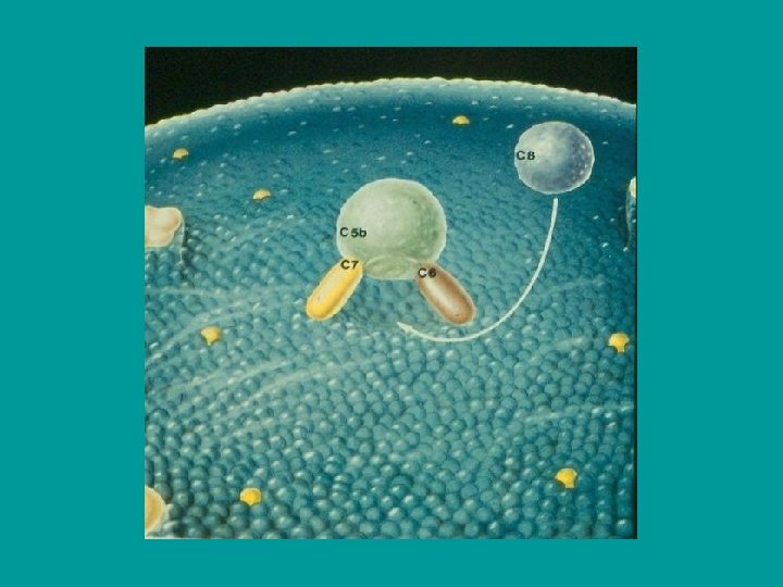 Terminal (lytic) phase of the complement cascade § C 5 b fragments creates a complex with C 6, C 7 and C 8, the complex dive into the lipid membrane of the cell and attached to it into a circle 13 -18 molecules of C 9 (MAC – membrane attack complex), thus create in the membrane pores and cell can lysis (G-bacteria, protozoans, some viruses). § Most microorganisms are resistant to this lytic effect of complement (protection by cell wall).