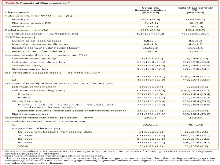 • 4 different revascularization strategies - complete revascularization at the index procedure, staged procedure during the hospitalization, staged procedure after discharge or culprit-only revascularization. • RESULT ; -A total - 2, 285 patients. • CR (i. e. , at the index procedure or as a staged procedure) was associated with a lower risk of (MACE). • The risk of all-cause mortality and spontaneous reinfarction was similar.