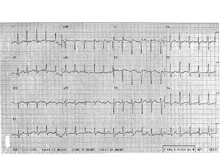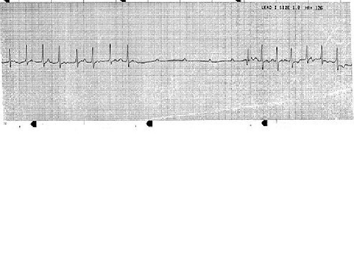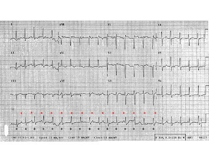 ECG & CASE DISCUSSION • 19 -year-old man presents to an ED with an episode of shortness of breath and syncope. He was mowing his lawn when he began to feel short of breath and light-headed, causing him to go inside where he reportedly "passed out. " • He was unresponsive but did not exhibit any seizure-like activity and he quickly regained consciousness. • He reports having palpitations, described as irregular, forceful beats, and fatigue for the past week, but the rest of his review of systems is grossly normal. • His vitals are: temperature, 96. 7°F (35. 9°C); • pulse rate between 40 and 120 bpm; • respiratory rate, 16 breaths per minute, blood pressure, 102/46 mm Hg; and oxygen saturation of 96% on room air. His physical examination is notable for an irregular tachycardia and multiple, bilateral macular erythematous lesions with central pallor on his thighs.