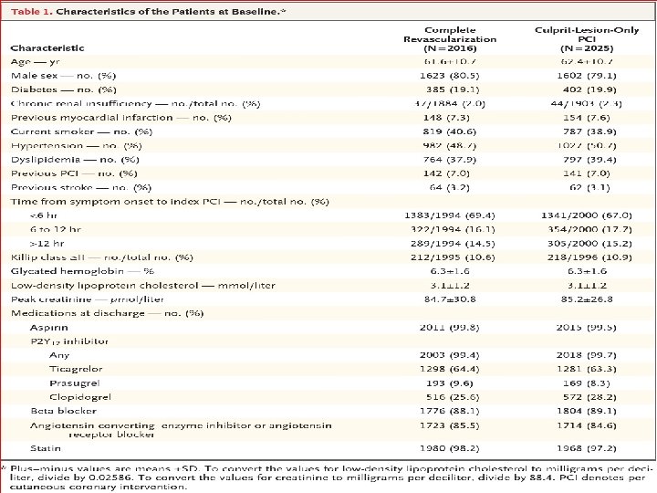 METHODOLOGY • The COMPLETE trial - multinational, randomized trial. • Patients with STEMI and multivessel coronary disease were randomized to complete revascularization (n = 2, 016) versus culpritonly revascularization (n = 2, 025). • Complete revascularization group- staged PCI during the index hospitalization or after hospital discharge (within 45 days).