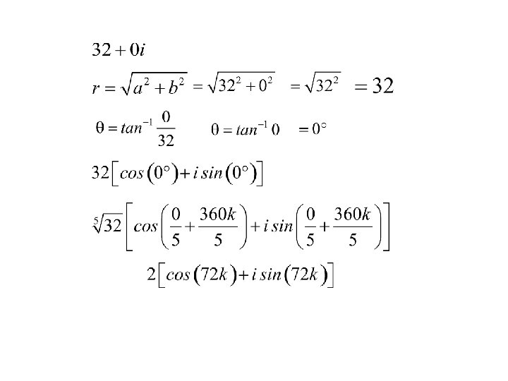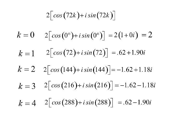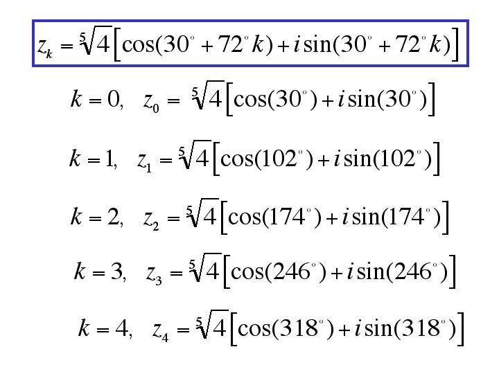 Find the complex fifth roots of The five complex roots are: for k = 0, 1, 2, 3, 4.