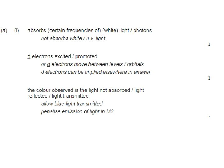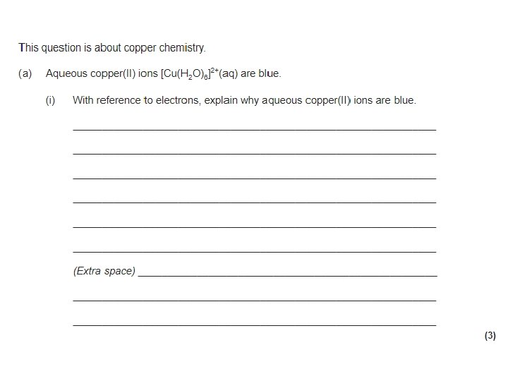 Why are Transition Metal Complexes Coloured? • TM have part filled d-orbitals. • So the e- can move from one d-orbital to another. • In a TM ATOM on its own (isolated), all of the d-orbitals are of EXACTLY the same energy • BUT in a COMPOUND, the presence of ligands makes the d-orbitals have slightly different energies. • When an e- moves from one d-orbital to another of a higher energy level, they often ABSORB energy. • This is known as ‘promotion’ or ‘excitation’ • The amount of energy absorbed depends on the difference in the energy levels • The bigger the energy, difference, the more energy the electron absorbs • The amount of energy absorbed is directly proportional to the frequency of the absorbed light and inversely proportional to the wavelength of light • For Copper 2+, the small difference means a low frequency and a high wavelength • This corresponds to red on the visible light spectrum • So blue light is transmitted